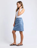 The Birdie Denim Skirt brings playful charm with its comfy elastic at the side seams and back waist, giving you the perfect fit every time. Its knee-length cut is easygoing and flattering, while the Elm-stamped hardware adds a fun, unique touch to this effortlessly stylish skirt.