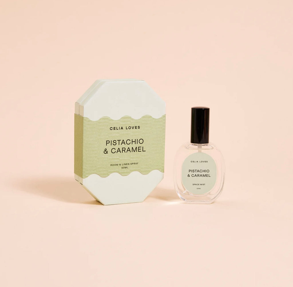 • Pistachio & Caramel - Room Spray 50ml-Celia Loves-Like Hailey Bieber’s daily makeup routine, Pistachio & Caramel is perfectly polished, paired back and #goals. A sophisticated scent blend that gives quiet luxury while still satisfying your sweet tooth. Top notes orange zest, pistachio, sweet jam Heart notes jasmine, caramel, malt Base notes classic vanilla, musk Handcrafted on the Surf Coast of Victoria using soy wax, the Celia Loves La Fiesta Collection is all about bringing the party and celebrating every