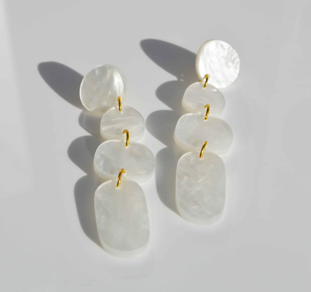 A contemporary earring with drops of organic shapes in a beautiful pearl coloured marble acrylic.  So sleek and timeless.