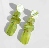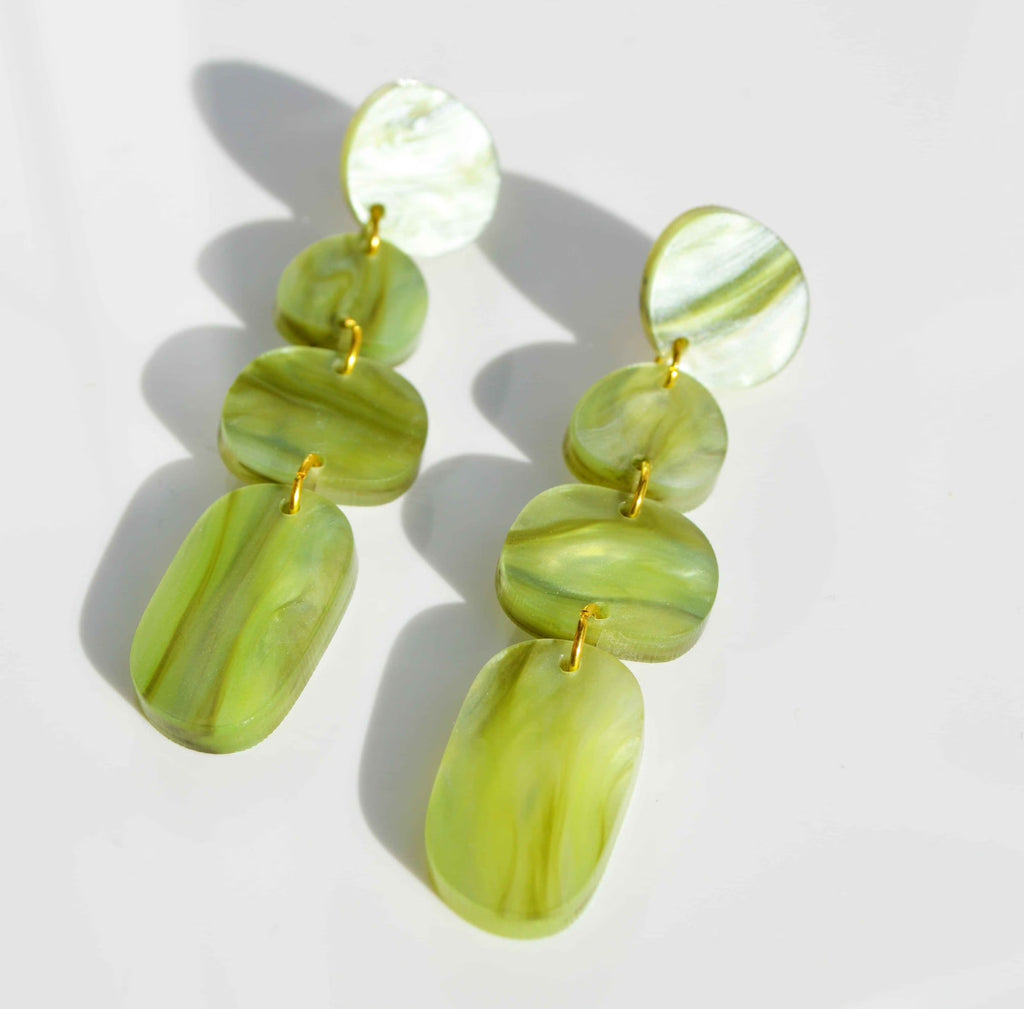 A contemporary earring with drops of organic shapes in a beautiful sage green coloured marble acrylic. So sleek and timeless.