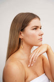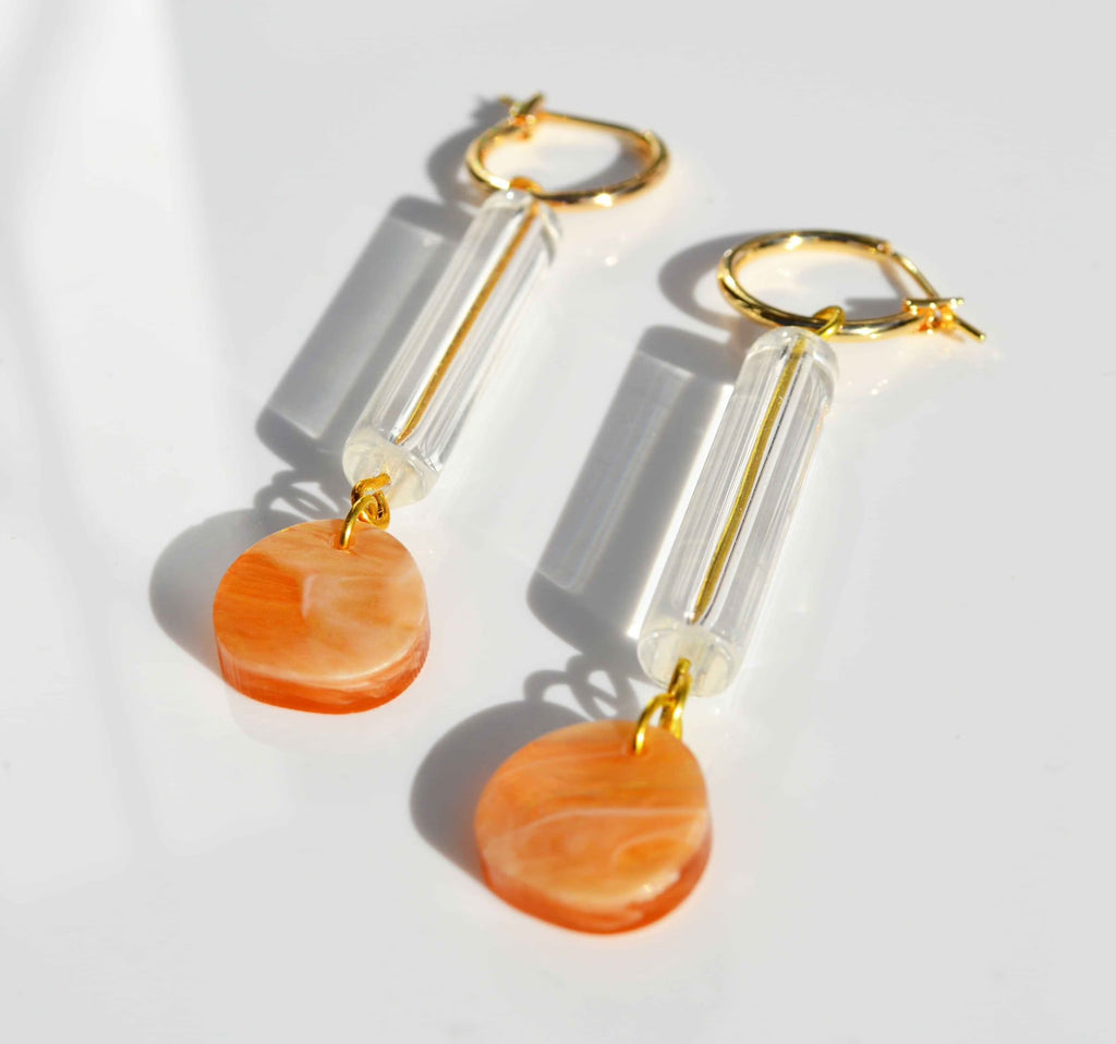A simply stunning, contemporary earring. Gorgeous clear glass tube bead with beautiful sunset marbled acrylic disc. Hanging from a sweet, wee huggie hoop.