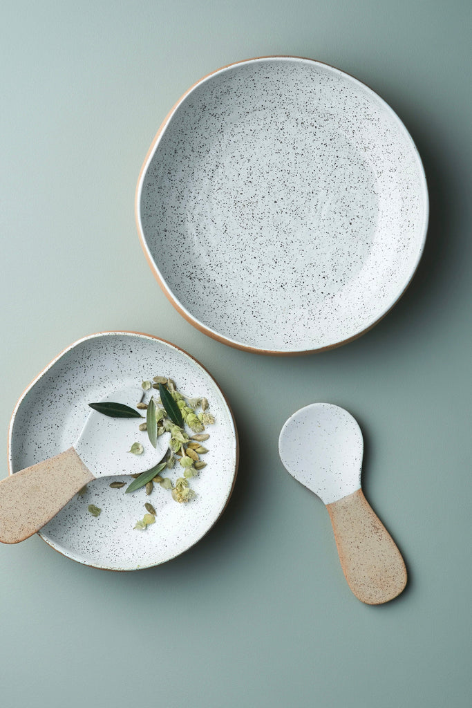 Garden To Table is a hand crafted range, using a high fired stoneware with iron flecks. At times, the iron flecks may appear to bleed in the clay body, creating unique patches of red or orange. This is a natural occurrence, when the iron meets with high temperatures in the kiln. It is part of the beautiful process of hand making pottery, and is not considered a fault. We hope that you enjoy the one-of-a-kind collection that is Garden to Table, and all its lovely imperfections.