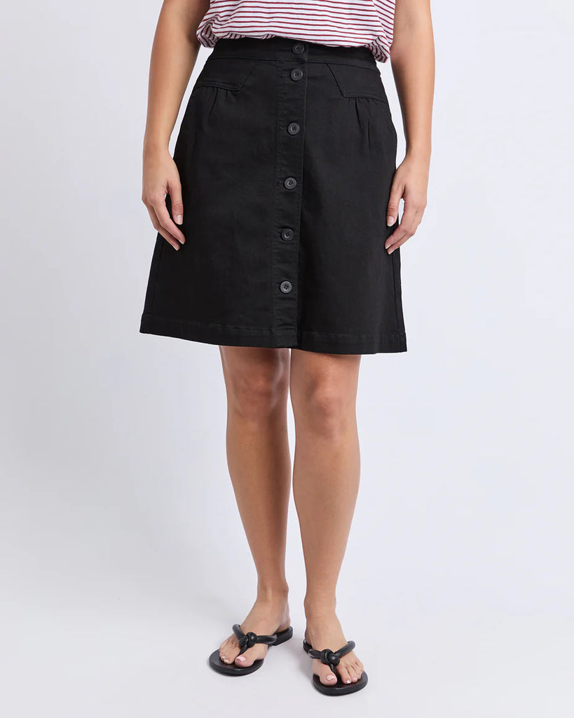 A little bit retro. A lot of cute. This A-Line denim button front skirt is a must-have this season. Featuring side pockets, front tuck detail and an elasticated back, this skirt looks great with strappy sandals and your favourite tee!