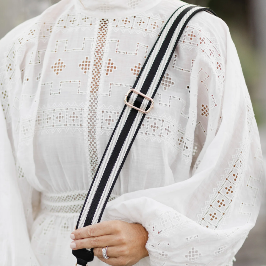 The Louenhide Daisy Guitar Strap Black is a sporty, yet classic accessory that will never go out of style. This simplicity of the stripe design makes this guitar strap versatile, adding a level of effortless style with the textured webbing finish. Embellished with beautiful light gold hardware and made to be adjusted to your desired length, this strap is a must have to mix and match.