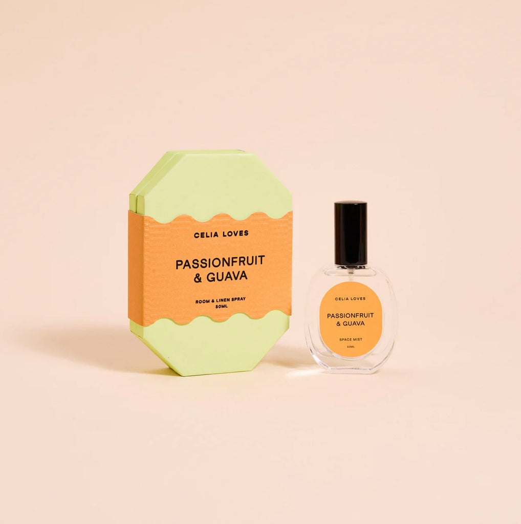 • Passionfruit & Guava - Room Spray 50ml-Celia Loves-Evocative of an endless vacation mood, this addictive blend of light sweetness and soft florals is complemented with a touch of sensuality from base notes of vanilla, musk and toasted almonds. Combat the winter blues and fill your space with heavenly, year-round summer. Top notes Passionfruit, Raspberry, Pineapple, Peach Heart notes Jasmine, White Rose, Rhubarb Base notes Vanilla, Musk, Toasted Almonds Handcrafted on the Surf Coast of Victoria using soy wax